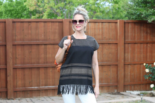 Black with gold stitching Mexican Top with Fringe